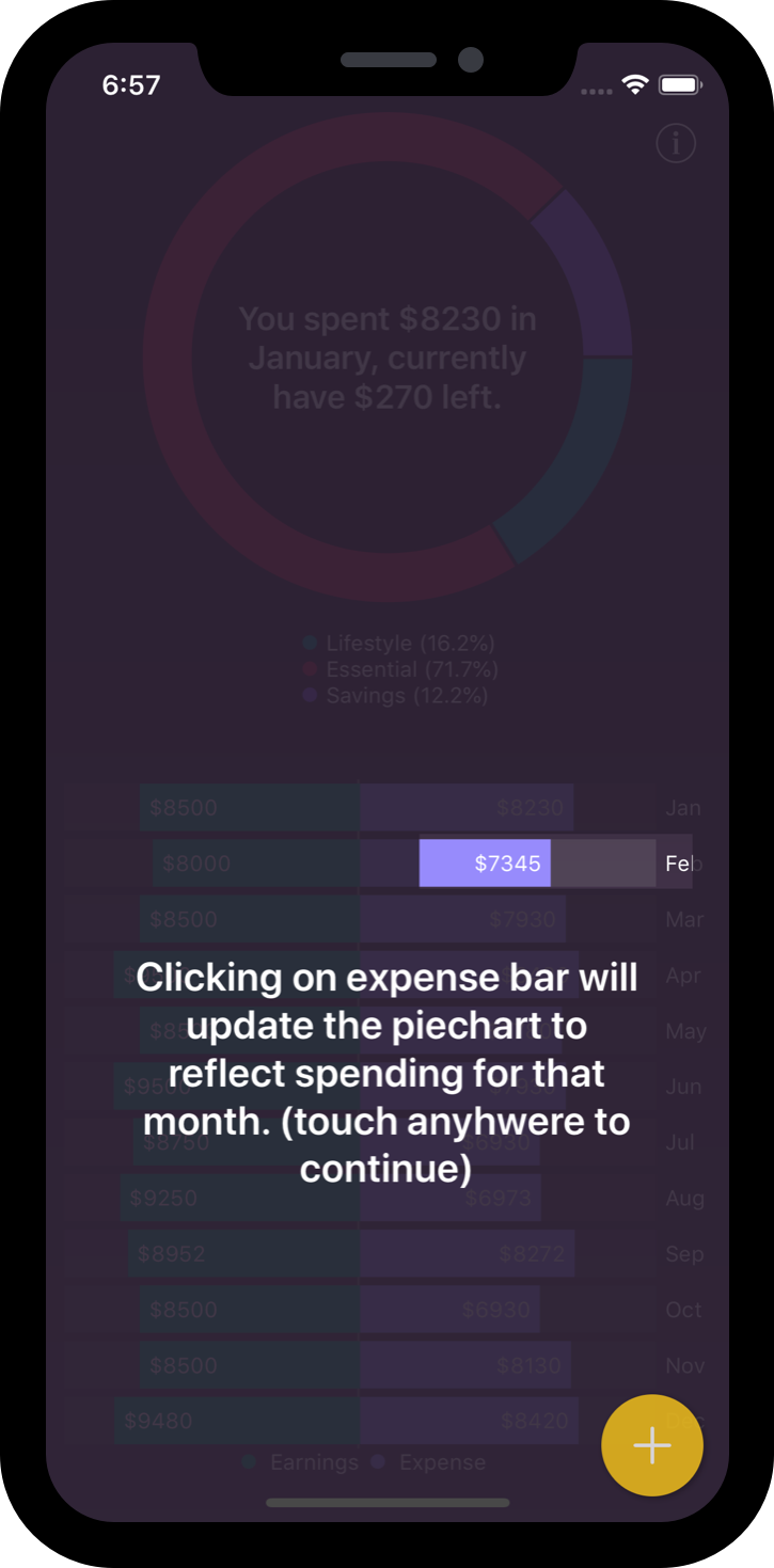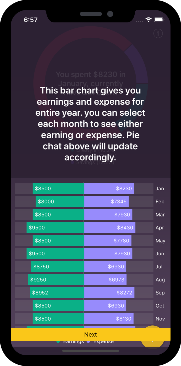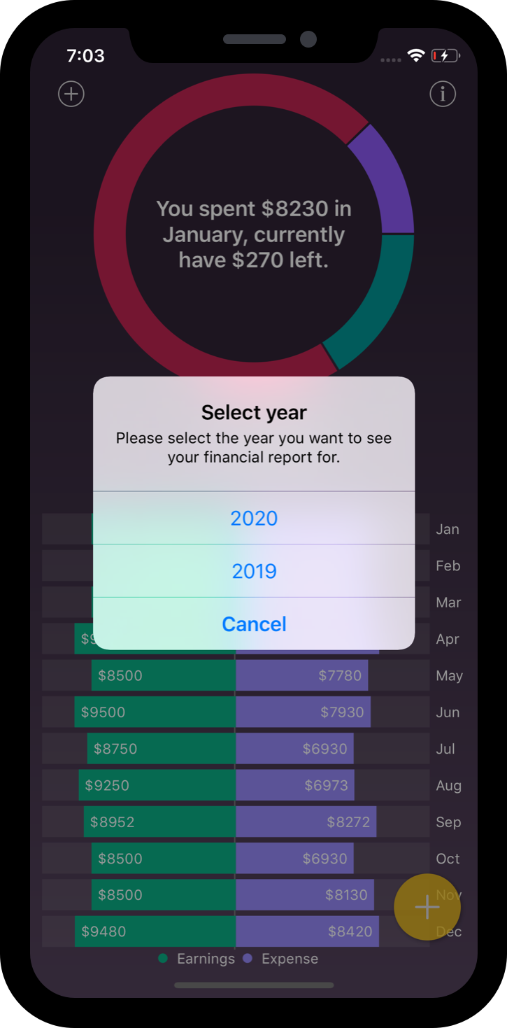 Use the visual reports to go through your income and expenses. Pop up pie chart display more and in detailed information about the various data in the income and expense category to monitor changes each month.