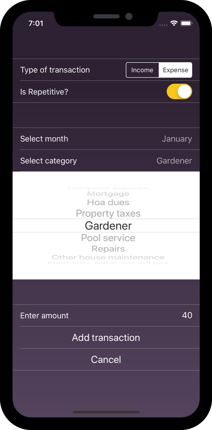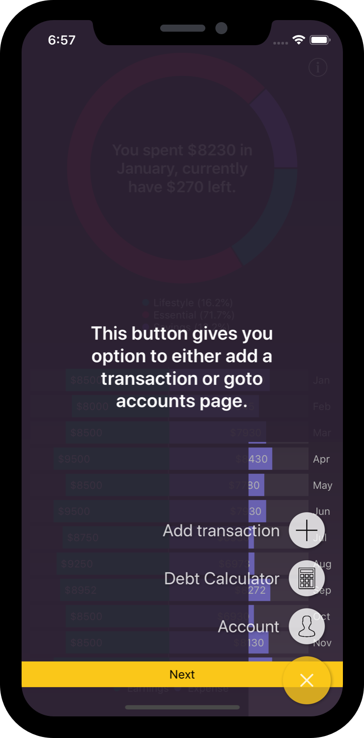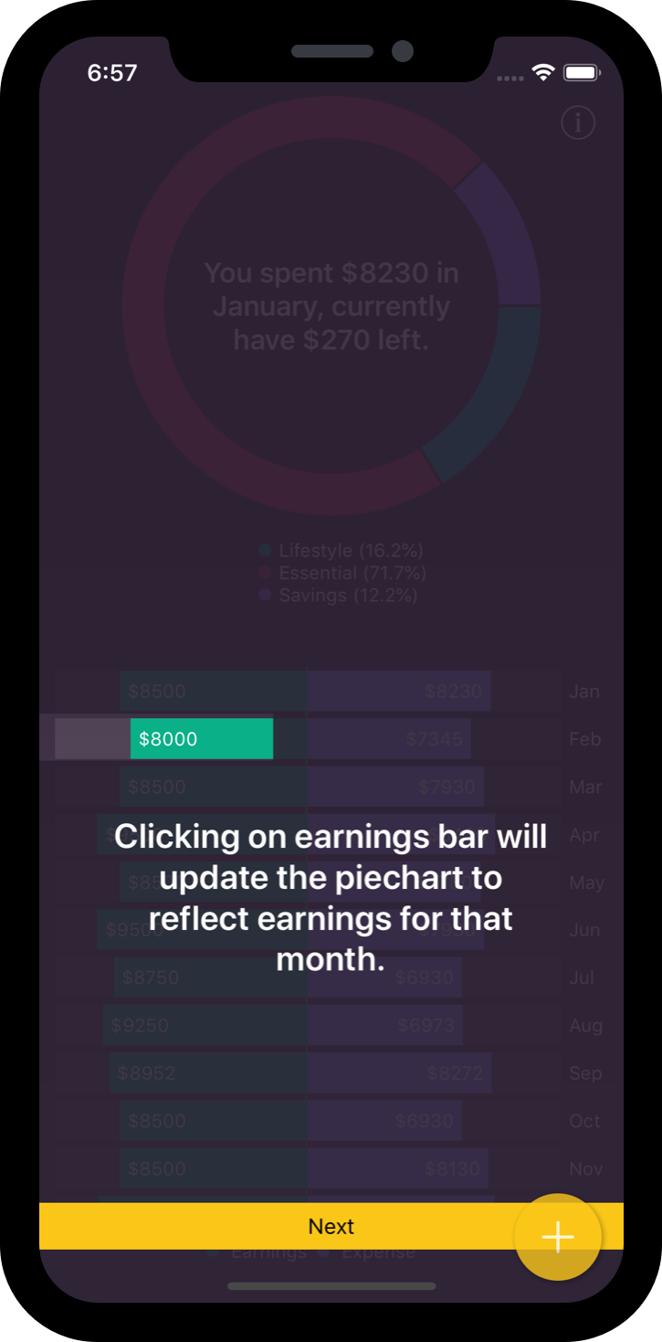 Use the visual reports to go through your income and expenses. Pop up pie chart display more and in detailed information about the various data in the income and expense category to monitor changes each month.